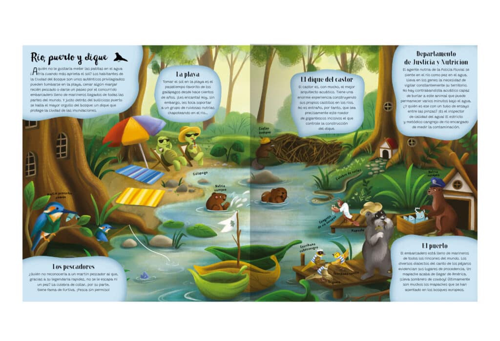 ¿Te puedes imaginar cómo sería la vida en el bosque si funcionara como una ciudad? El líder de la jauría de lobos podría ser el alcalde, los venados serían lo más granado de la sociedad y el grajo alardearía de sus excepcionales habilidades como artista callejero. Habría un servicio postal de palomas mensajeras, además de una apasionante vida nocturna. Ven a visitar la Ciudad del Bosque para conocer a sus habitantes y aprender un montón de cosas sobre los distintos barrios de la ciudad. Y si te pierdes, no te preocupes: el libro incluye un mapa de fácil comprensión.