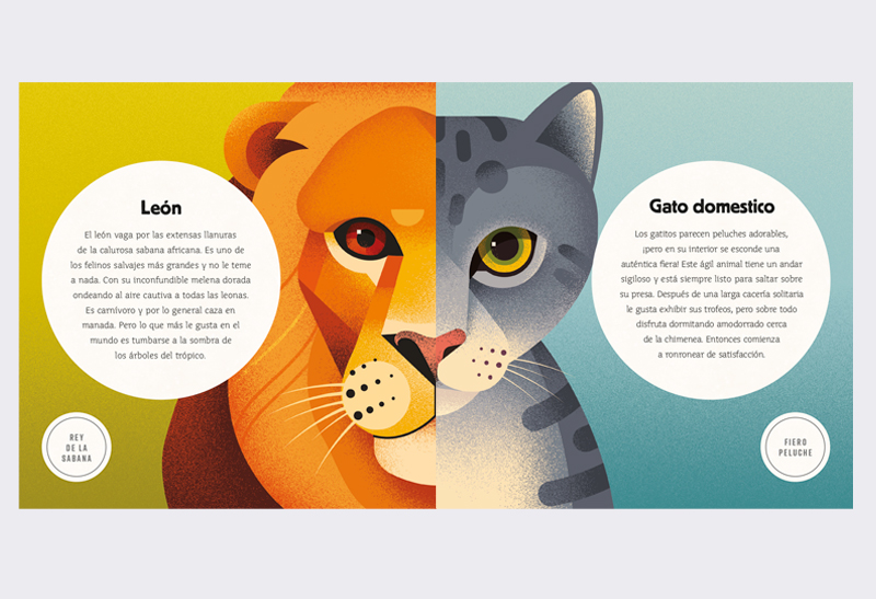 Echa un vistazo a los dibujos de algunos animales domésticos y salvajes muy conocidos. ¿Puedes adivinar qué tienen en común y en qué se diferencian? En las páginas desplegables de este libro aprenderás que existen muchas semejanzas y diferencias curiosas entre estos dos grupos. ¡Quizá te des cuenta de que tienes un pequeño lobo o león viviendo en casa! Pero así también entenderás un poco mejor el lenguaje en que te habla tu mascota.
